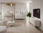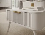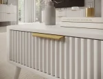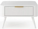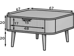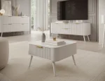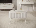 Konferenčný stolík Chavelle (67×40×67 cm) spája eleganciu a funkčnosť a dokonale dopĺňa modernú obývaciu izbu. Predná strana je z odolnej MDF s ABS hranou a rýhovaným povrchom, ktorý dodáva jedinečný charakter. Korpus z laminovanej drevotriesky zaručuje stabilitu a odolnosť na každodenné použitie. Stolík je vybavený jednou praktickou zásuvkou na kolieskových lištách, ktorá umožňuje plynulé a tiché otváranie. Biele drevené nohy (20 cm) pridávajú ľahkosť a moderný vzhľad, zlaté kovové úchytky sú elegantným štylistickým akcentom. Konferenčný stolík Chavelle je výbornou voľbou pre tých, ktorí oceňujú sofistikovaný dizajn a pohodlie.