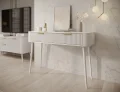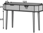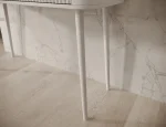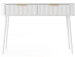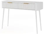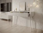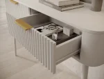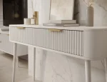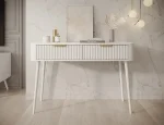 Toaletný stolík Chavelle (120×80×40 cm) je elegantný a funkčný kus nábytku v modernom štýle, ideálny do spálne alebo šatne. Predná časť je z odolnej MDF dosky s ABS hranou a rýhovaným vzorom, ktorý dodáva toaletke rafinovaný vzhľad. Korpus z laminovanej drevotriesky poskytuje pevnosť a odolnosť. Nábytok je vybavený dvoma praktickými zásuvkami na kolieskových lištách na plynulé a tiché otváranie. Vysoké biele drevené nohy (60 cm) dodávajú ľahkosť a eleganciu a zlaté kovové úchytky podčiarkujú moderný charakter. Toaletný stolík Chavelle je spojením nadčasového dizajnu, funkčnosti a vysokej kvality prevedenia, čo ho robí ideálnym do súčasných interiérov.