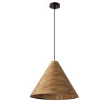 Abażur z forniru dębowego wprowadza do jadalni ciepły, naturalny akcent. Klosz o średnicy 33 cm dobrze zaznacza miejsce serwowania posiłków przy prostokątnym lub okrągłym stole. Regulowana długość zawiesia pozwala zawiesić oprawę niżej nad blatem lub wyżej nad ciągiem roboczym w kuchni. Czarna podsufitka i przewód porządkują wizualnie strefę sufitu, co sprzyja spokojnej aranżacji części dziennej.