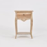 Svetlo hnedá skrinka na ohnutých nohách. Nábytok je vyrobený z brúsenej, bielej drevenej rastliny. Má odreniny, rezbárske a dekoratívne kovové rukoväte.