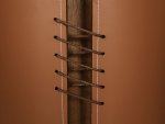 Moderný cylindrický stôl potiahnutý ekokožou s viditeľným prešívaním a ozdobným šnurovaním. Stolová doska je vyrobená zo spekaného kameňa imitujúceho mramor. Skrinka sa otvára a má jednu policu.