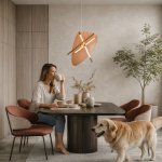 Szklany klosz w kształcie zbliżonym do tarczy zegara dobrze wyznacza strefę nad stolikiem kawowym. Światło skupia się na blacie, ułatwiając odkładanie książek, pilotów i napojów podczas wieczornego odpoczynku. Zwisająca forma sprawdza się także nad wąską konsolą w strefie wejściowej, gdzie potrzebne jest łagodne, ale wyraźne oświetlenie. Wysokość zawieszenia można dopasować do układu mebli, dzięki czemu lampa nie przesłania widoku w głąb pomieszczenia.
