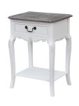 Skrinka v provenzálnom štýle s bielymi rezbami s utretými tmavo hnedými vrcholmi. Produkt má kovové rukoväte a ohnuté nohy.