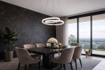 Oświetlenie nad stołem w zmieniającej się jadalni Ta lampa wisząca pozwala dopasować światło do pory dnia i nastroju przy stole. Okrągła forma zawieszona na linkach porządkuje przestrzeń nad blatem, niezależnie od ustawienia krzeseł. Zmienna barwa światła pomaga przełączać jadalnię między miejscem pracy, nauki i spokojnych posiłków. Złoty kolor konstrukcji wprowadza ciepły akcent do nowoczesnych, stonowanych wnętrz. Rozmiar oprawy sprawdzi się nad stołem w średniej lub większej jadalni. Marka Lighting łączy tutaj prostą formę z funkcjonalnym sterowaniem barwą. Lampa wisząca do jadalni i spotkań przy stole Zwieszana konstrukcja dobrze zaznacza strefę jedzenia w otwartej części dziennej. Nad prostokątnym stołem równomiernie oświetla talerze i blat, ułatwiając serwowanie posiłków. Podczas wieczornych rozmów przy winie można przejść na cieplejszą barwę, sprzyjającą relaksowi. W ciągu dnia jaśniejsze światło neutralne pomaga przy odrabianiu lekcji lub pracy z laptopem. Złota lampa wisząca nad stół komponuje się z ciemnym blatem, tworząc wyraźny, ale spokojny akcent. W salonie z dużymi przeszkleniami światło podkreśla fakturę stołu, a nie odbija się nadmiernie w szybach. Rozkład światła i zmienna barwa LED Zintegrowany moduł LED zapewnia stałe, równomierne światło bez widocznych punktów diod – wygodne przy dłuższych posiłkach. Strumień 2240 lumenów daje odczuwalnie jasne oświetlenie stołu – przydatne podczas rodzinnych spotkań i gier planszowych. Zmienna barwa 3000–6500K pozwala przejść od ciepłego, nastrojowego światła wieczorem do chłodniejszego, pobudzającego rano. Metalowy korpus z silikonową linią światła kieruje blask głównie w dół i na boki – ogranicza olśnienie osób siedzących przy stole. Regulowane linki zawieszenia pomagają dobrać wysokość tak, aby lampa nie zasłaniała widoku rozmówcom. Wybór do nowoczesnej strefy dziennej Ta złota, pierścieniowa oprawa sprawdzi się w jadalniach i salonach urządzonych nowocześnie, gdzie ważne jest klarowne wyznaczenie stref nad stołem. Lampa wisząca sufitowa z regulowaną barwą będzie praktycznym rozwiązaniem w przestrzeniach, które w ciągu dnia służą pracy, a wieczorem spokojnemu odpoczynkowi przy wspólnym posiłku.
