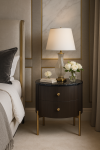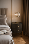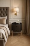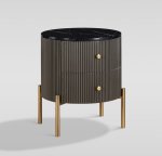 Štýlový nočný stolík v grafitovej farbe so zlatými akcentmi a nohami. Rám má drážkovanú drevenú povrchovú úpravu a vrchnú časť s mramorovou povrchovou úpravou.