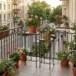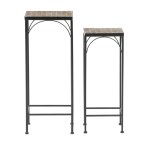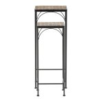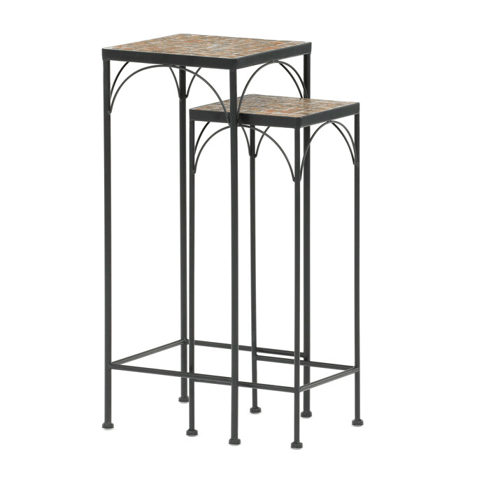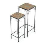 Súprava dvoch stojanov na kvety kombinuje pevnú kovovú podnož s keramickou doskou zdobenou krémovou mozaikou, ktorá vytvára jemný dekoratívny prvok. Vďaka elegantnému spojeniu materiálov a prírodných odtieňov stojany vyniknú ako v interiéri, tak na terase či balkóne. Vhodné na vystavenie kvetov v rôznych veľkostiach a typoch nádob.