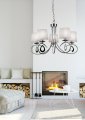 Chrómová základňa s originálnym tvarom a jemne skrútenými ramenami doplnená bielymi zvlnenými tienidlami. Na každom ramene voľne visí kovový dekoratívny prvok v tvare slzy. Perfektný produkt pre klasické interiéry, ktoré vyžadujú osviežujúce aranžmány. Sada obsahuje trojramennú a päťramennú závesnú a stolovú lampu. Dostupné aj v patinovanej farbe s krémovými tienidlami.